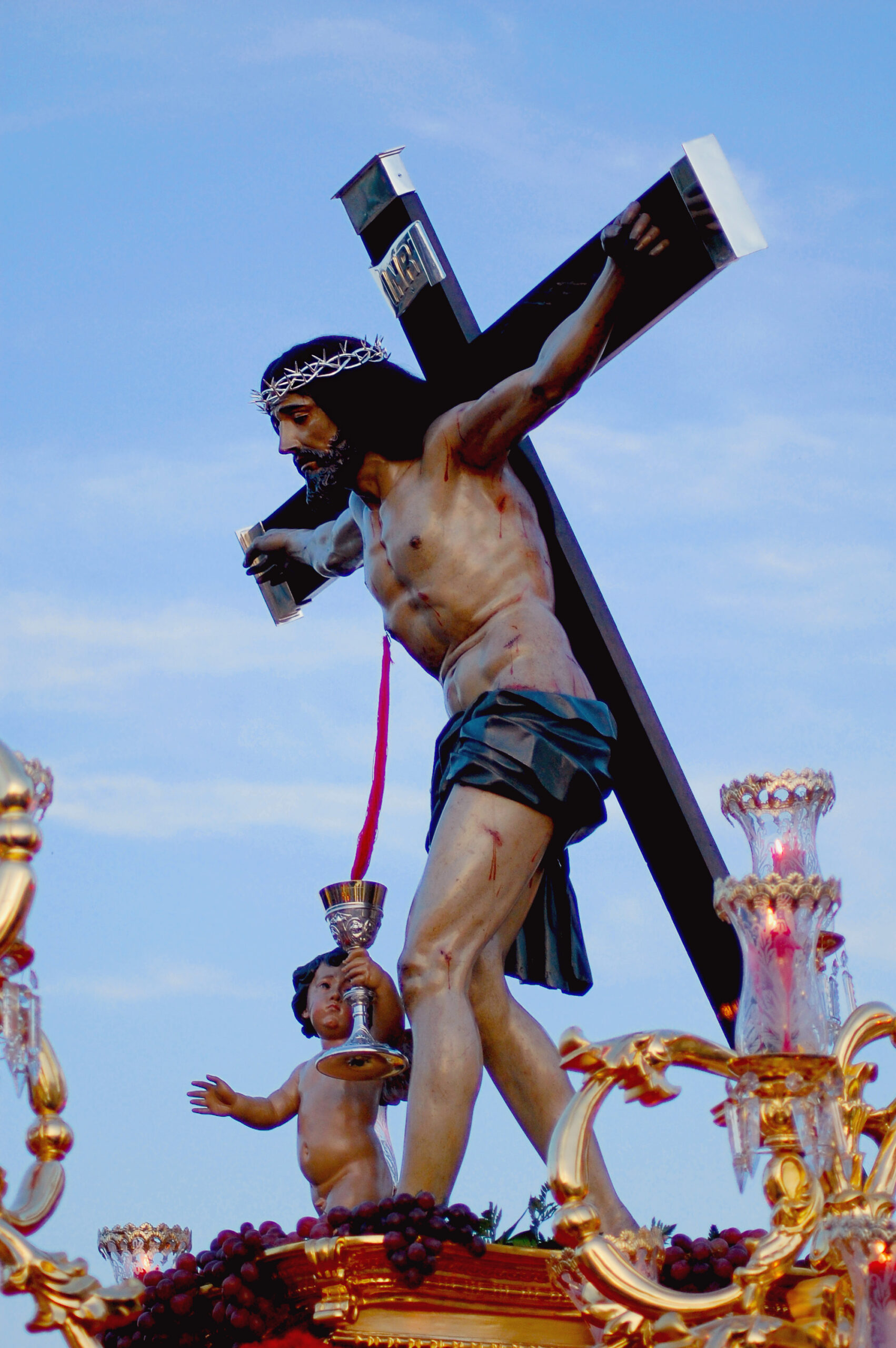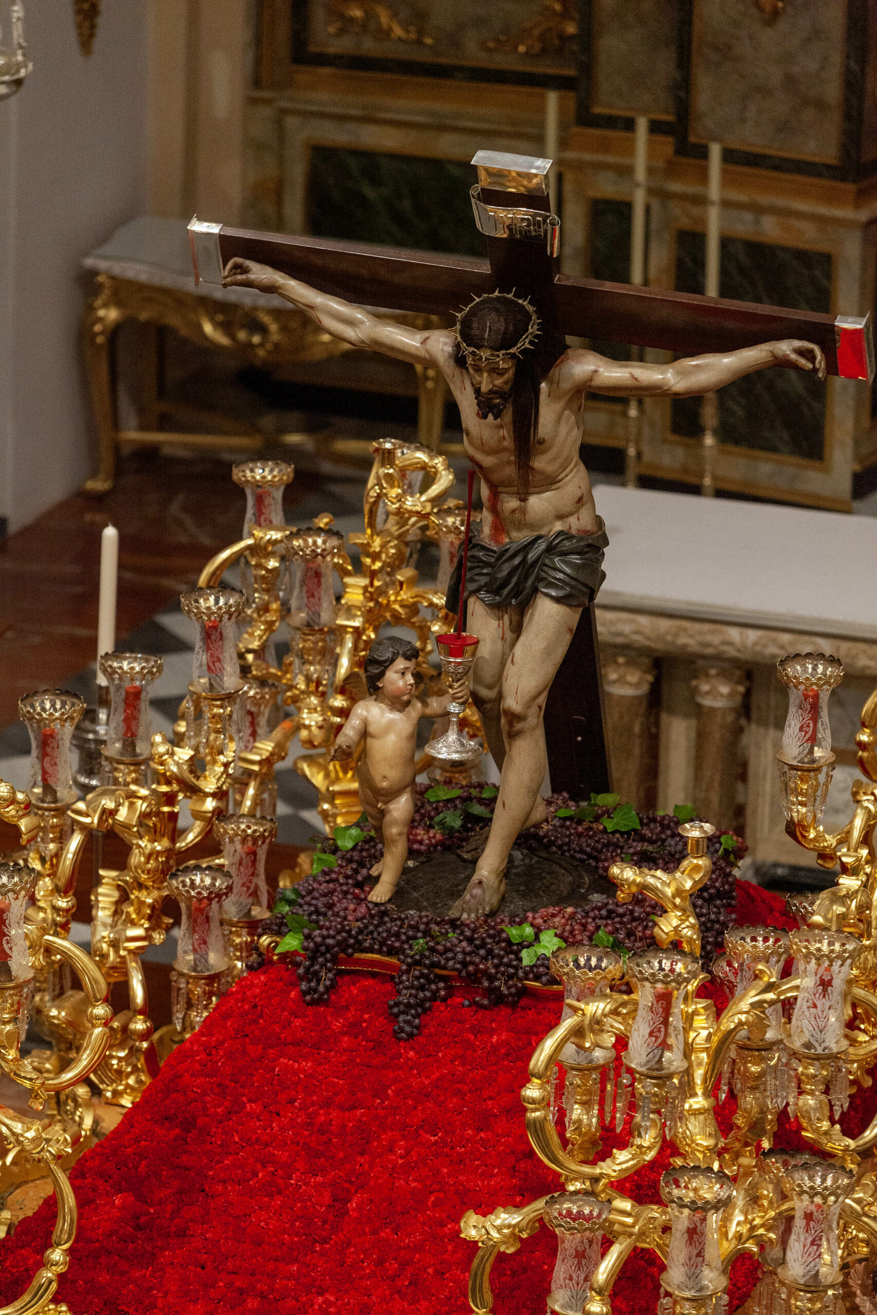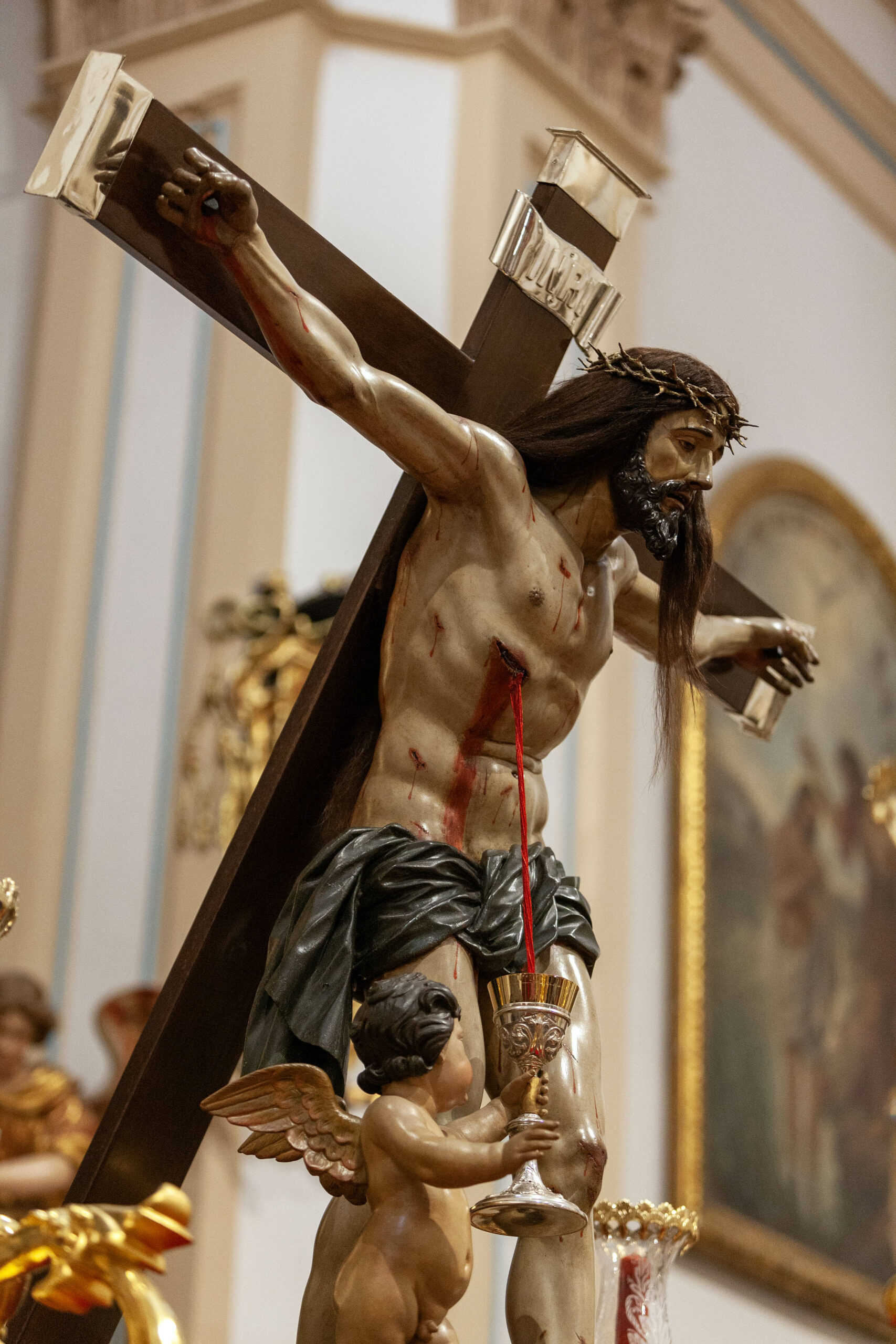Estamos ante una de las imágenes más emblemáticas y de mayor devoción de la escultura pasionaria murciana; tallada con un exhaustivo estudio anatómico en madera de ciprés, provista de ojos de cristal y cabello natural, con unas dimensiones que oscilan los 1’40 x 140 x 0’56 metros. En el año 1693, el escultor Nicolás de Bussy creó esta singular representación de un Cristo crucificado de las manos, mientras los pies desclavados pisaban las uvas en un lagar, al tiempo que derramaba la sangre redentora de su costado recogida en un cáliz por un ángel-niño sentado sobre una columna jónica, mientras otros cuatro angelitos en actitud caminante sostenían sus cálices, distribuidos en las cuatro esquinas del trono en clara referencia a las cuatro llagas restantes, donde recibían los surtidores de roja sangre procedentes de las manos del Redentor.