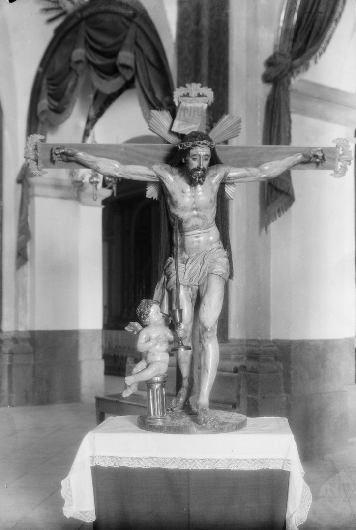 ha desprendido de la cruz sus dos pies, y adelanta la pierna izquierda como andando: los brazos los tiene clavados en la cruz, que tiene cuatro ráfagas angulares, y el ramal de ésta se apoya oblicuamente descansando en la agobiada espalda y en la peana: la cabeza tiene un aspecto estraño y altamente espresivo dirigiéndose al espectador: delante de la estatua al lado izquierdo, hay de pié un niño de 1m.52 de altura, con un cáliz que recibe en él una madeja de seda roja que parte de la herida del costado figurando la sangre, y otros cuatro niños hay del mismo tamaño, uno en cada estremo de la peana, los que tienen tambien calices, recibiendo cada uno su hebra de seda de aquel color de sangre, saliendo dos de ellas de cada mano del Señor: la espresion de estos niños es muy tierna y contristada.