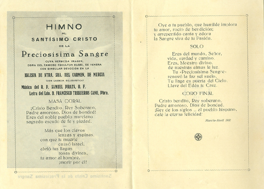 Himno al Cristo de la Preciosísima Sangre, compuesto en Murcia, en abril de 1933, con música del P. Samuel Prats, O.F., y letra de Francisco Trigueros Cano, presbítero. Fuente: Archivo General de la Región de Murcia.