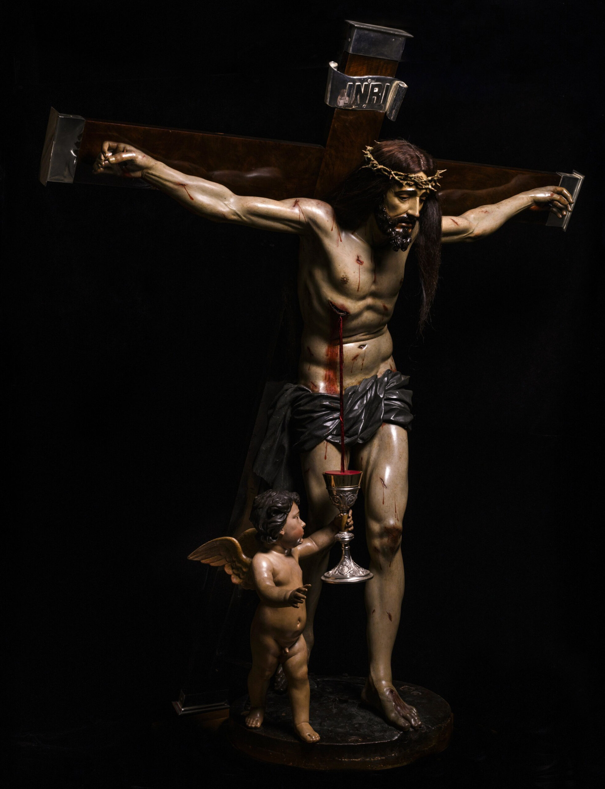 Cristo vertiendo el Néctar Preciosísimo en cálices y recogido por los cinco ángeles esculturados, que se conservan entre archicofrades y amantes del Cristo y estudiosos de nuestra imaginería: uno va unido a la imagen, y los restantes en poder de don José Hernández Mora, Dr. Alfonso Marín de Espinosa y Sres. Orts Román (Elche, Huerto del Cura).