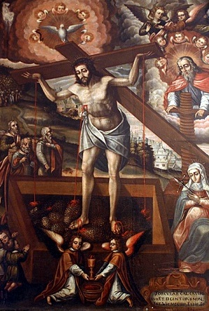 Es una representación del Lagar Místico, una alegoría enormemente teatral en la que la Sangre del Señor se vierte sobre la uva pisada, también por Él, y que conjuntamente se derrama para redimir a la humanidad. Todo el conjunto conforma una fuente de redención. Durante la Edad Media el misterio del Lagar Místico no es prácticamente desarrollado. Con el posterior cambio de mentalidad en la sociedad, se tiende a buscar un Cristo más humano, con un sufrimiento más perceptible. Es ahí cuando aparece la iconografía de la Prensa Mística; Cristo, en un lagar, es prensado por una viga accionada por Dios y el Espíritu Santo. La Sangre de Cristo junto con el jugo de uva es recogida por personalidades importantes de la Iglesia o por ángeles, que la distribuyen a los fieles. Así, se quería hacer ver que Jesús derramaba su Sangre por la salvación de los hombres.