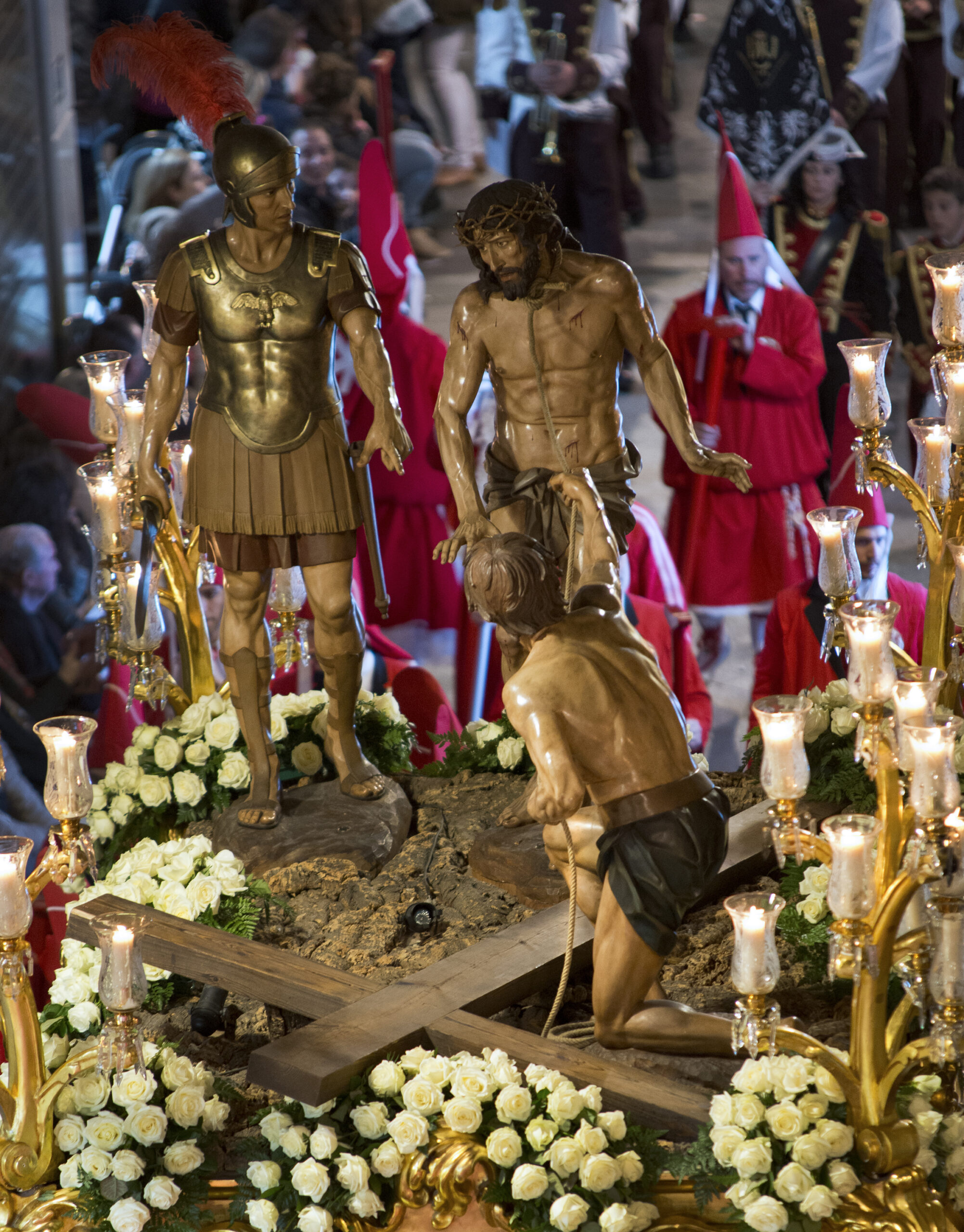 El paso es portado por 36 nazarenos estantes. Tiene un peso de 1.170 kilogramos en procesión.