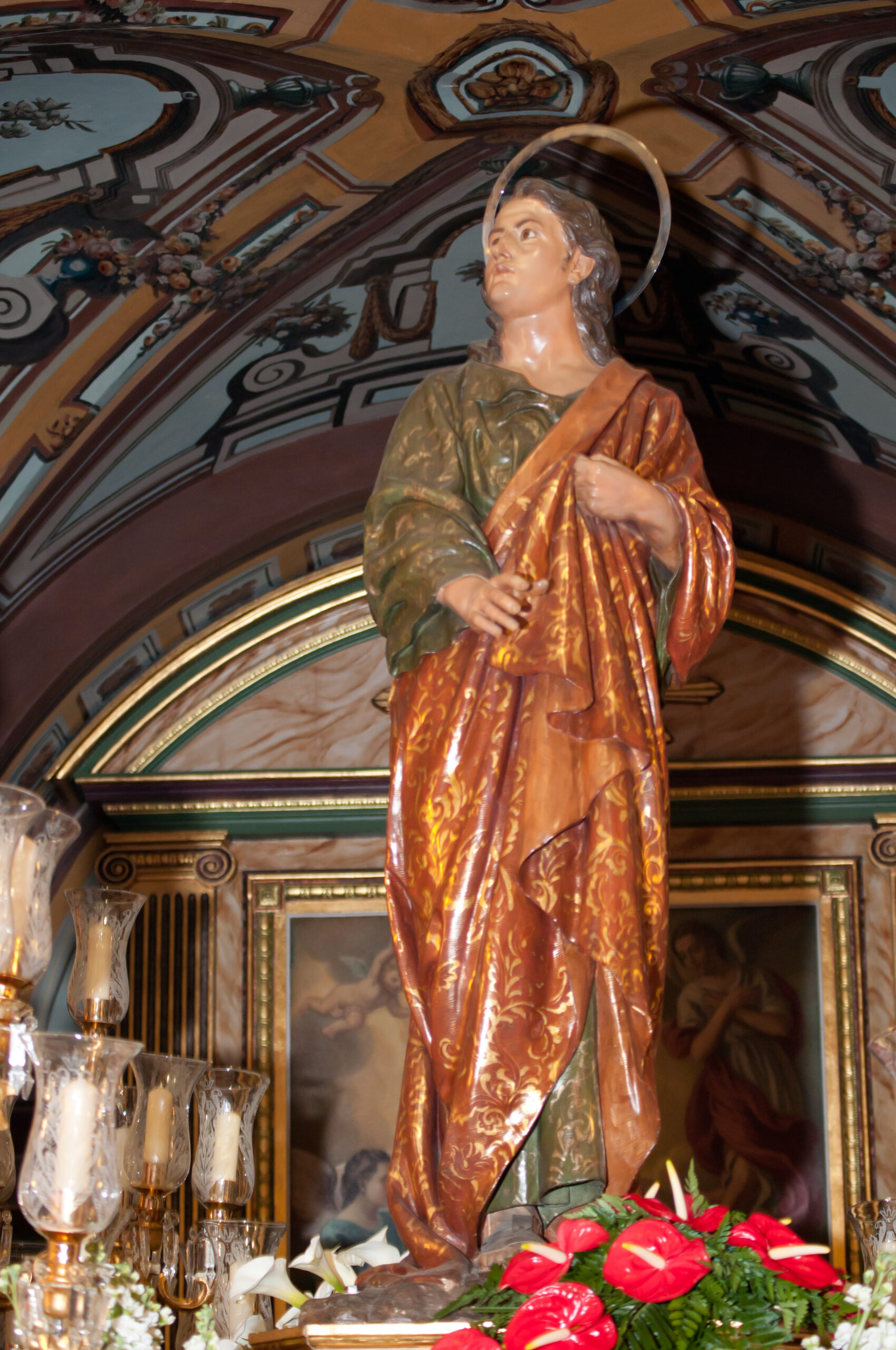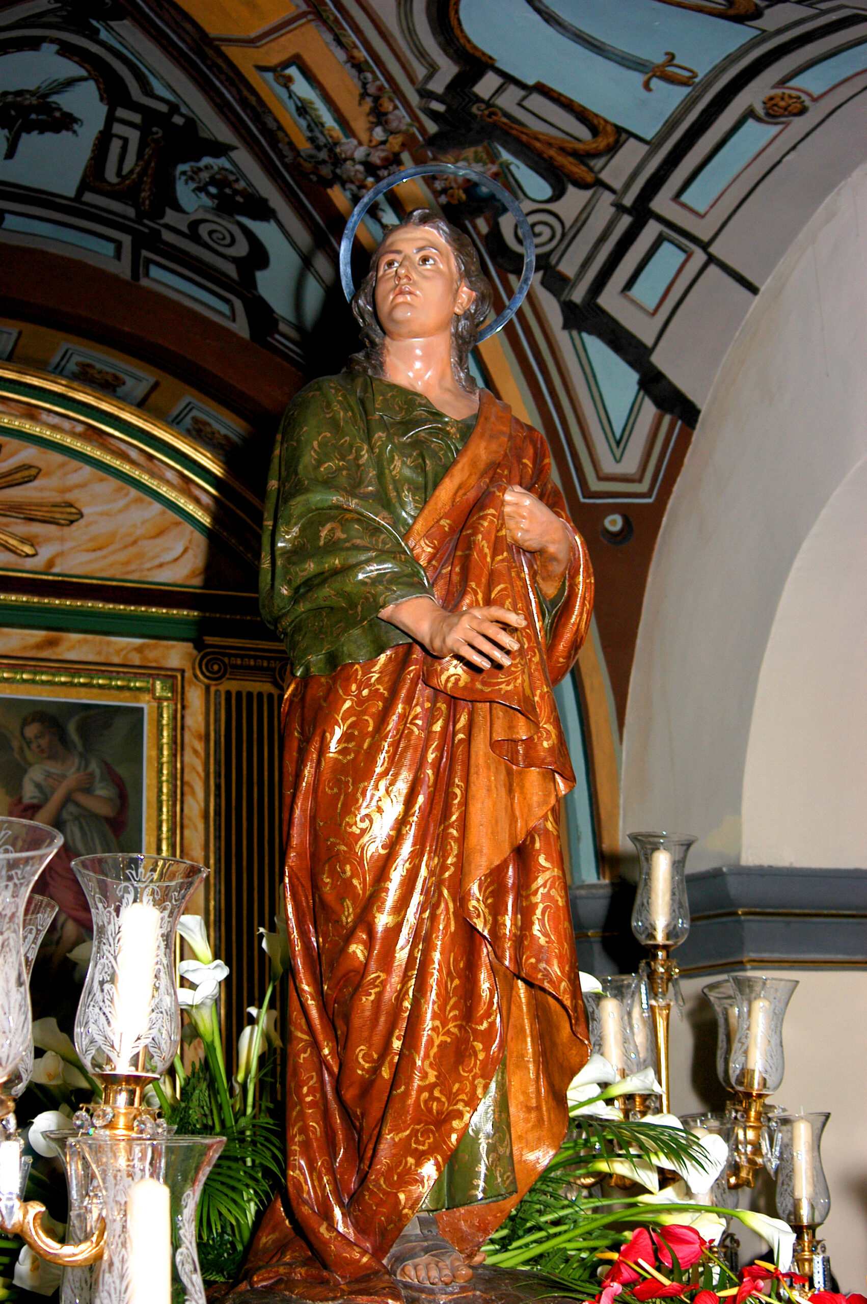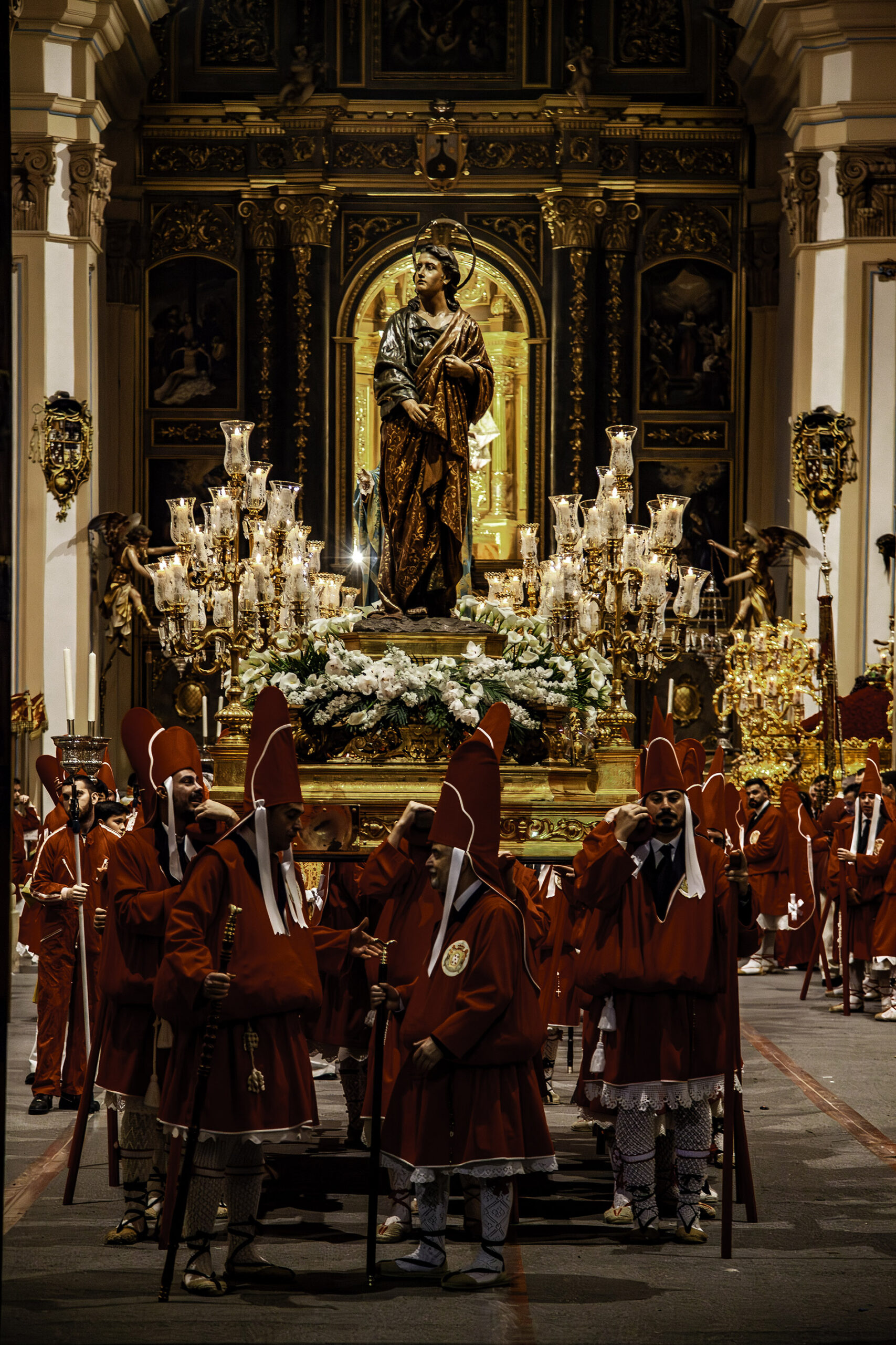 Obra del escultor valenciano Juan Dorado Brisa en 1905. El escultor presenta al apóstol en disposición de caminar hacia el Calvario, recogiéndose el manto con la mano izquierda. Se salvó de la Guerra Civil gracias a la familia Atienza, que ejercía la camarería del paso. Esta imagen destaca por la precisa talla, la limpieza de los paños y un rostro bello, sereno y altivo, que alza la mirada a lo alto. Dorado aplicó a la imagen en su vestuario los colores habituales para el joven apóstol: rojo en el manto y verde oscuro para la túnica, destacando la excelente estofa de estampados florales, que combina la plata en la túnica y el oro en el manto. La ejecución del actual trono se debe al tallista Andrés Pujante.